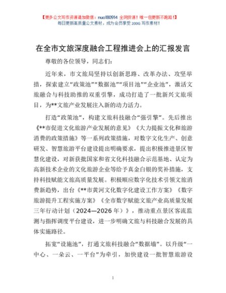 / 在全市文旅深度融合工程推进会上的汇报发言