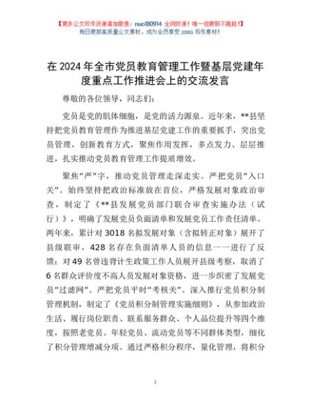 / 在2024年全市党员教育管理工作暨基层党建年度重点工作推进会上的交流发言