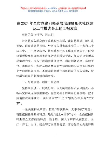 / 在2024年全市党建引领基层治理暨现代社区建设工作推进会上的汇报发言