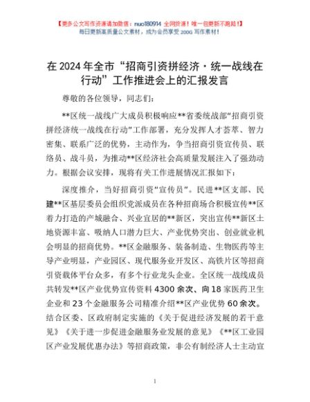 / 在2024年全市“招商引资拼经济·统一战线在行动”工作推进会上的汇报发言