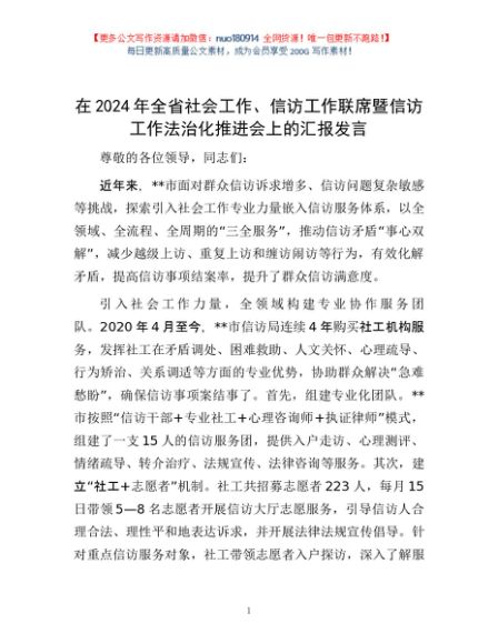 / 在2024年全省社会工作、信访工作联席暨信访工作法治化推进会上的汇报发言