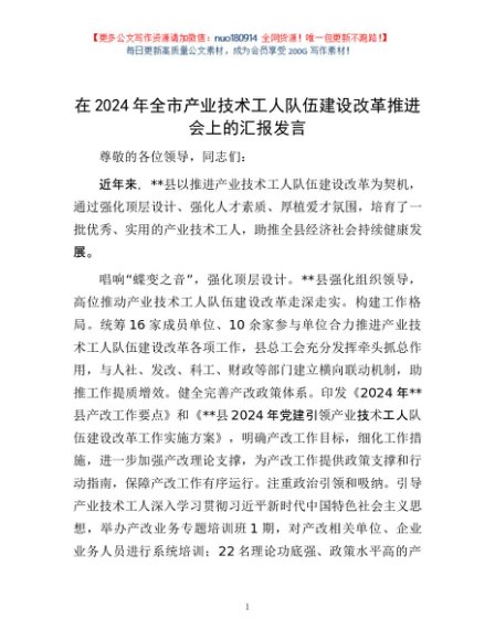 / 在2024年全市产业技术工人队伍建设改革推进会上的汇报发言