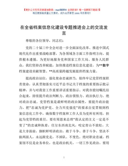 / 在全省档案信息化建设专题推进会上的交流发言