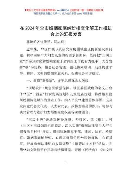 / 在2024年全市婚姻家庭纠纷排查化解工作推进会上的汇报发言