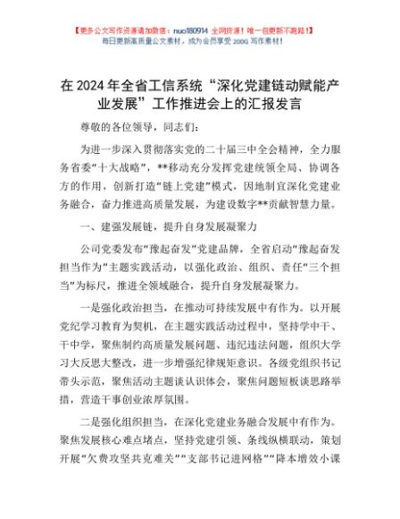 / 在2024年全省工信系统“深化党建链动 赋能产业发展”工作推进会上的汇报发言