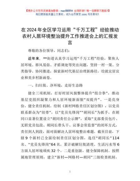 / 在2024年全区学习运用“千万工程”经验推动农村人居环境整治提升工作推进会上的汇报发言