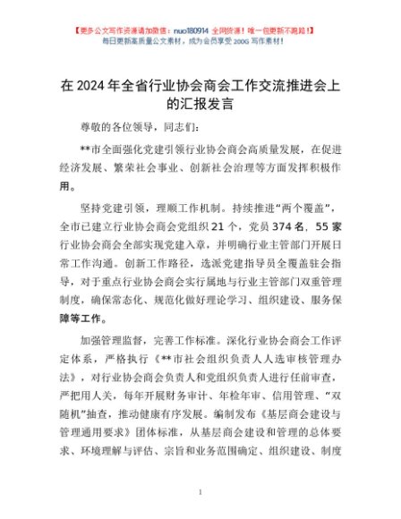 / 在2024年全省行业协会商会工作交流推进会上的汇报发言
