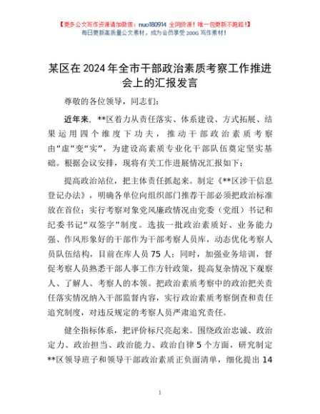 / 某区在2024年全市干部政治素质考察工作推进会上的汇报发言