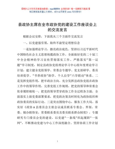 / 县政协主席在全市政协党的建设工作座谈会上的交流发言