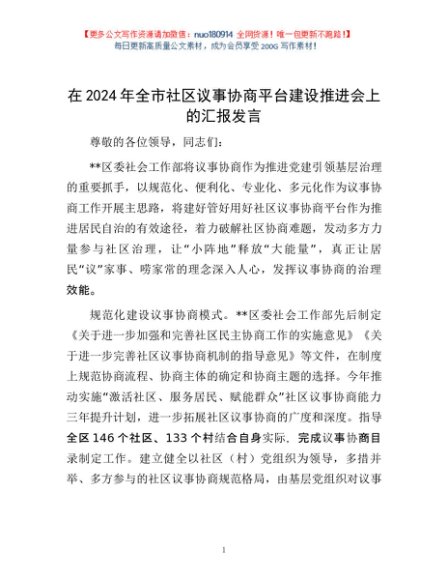 / 在2024年全市社区议事协商平台建设推进会上的汇报发言