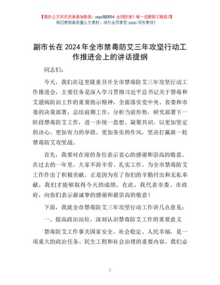 / 副市长在2024年全市禁毒防艾三年攻坚行动工作推进会上的讲话提纲