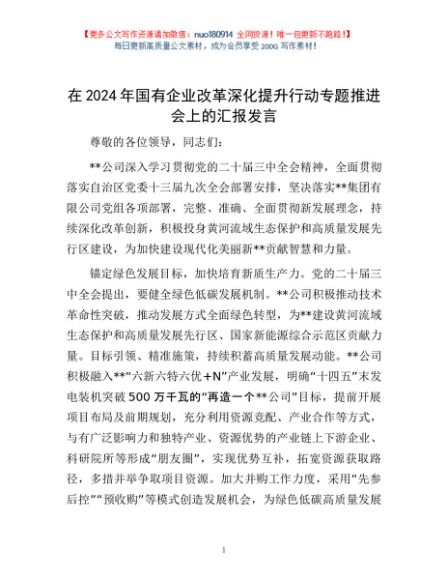 / 在2024年国有企业改革深化提升行动专题推进会上的汇报发言