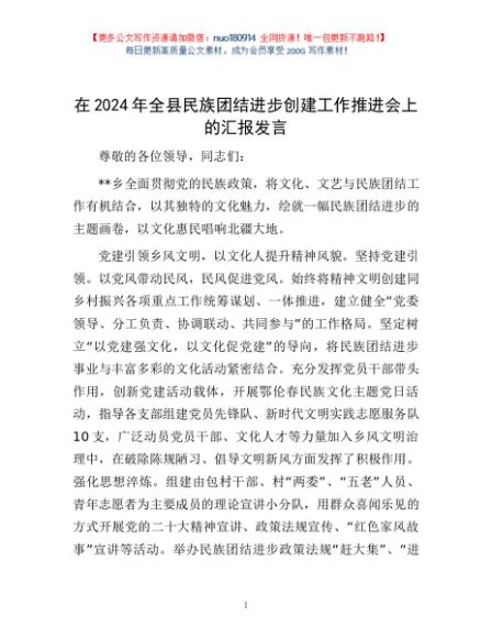 / 在2024年全县民族团结进步创建工作推进会上的汇报发言