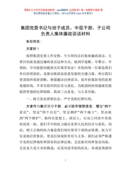/ 集团党委书记与班子成员、中层干部、子公司负责人集体廉政谈话材料