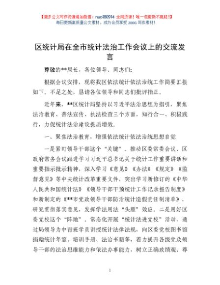 / 区统计局在全市统计法治工作会议上的交流发言