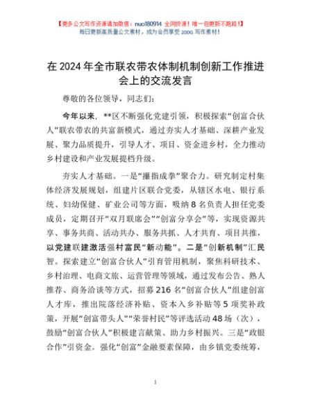 / 在2024年全市联农带农体制机制创新工作推进会上的交流发言