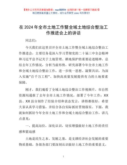 / 在2024年全市土地工作暨全域土地综合整治工作推进会上的讲话