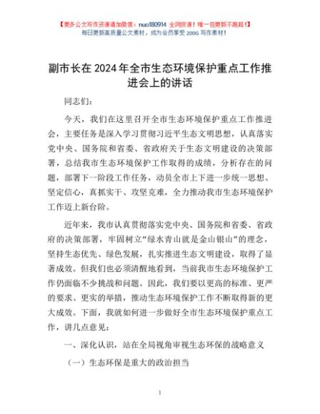 / 副市长在2024年全市生态环境保护重点工作推进会上的讲话