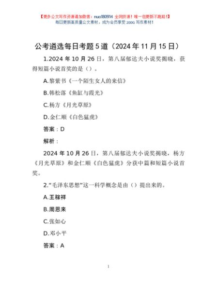 / 公考遴选每日考题5道(2024年11月15日)