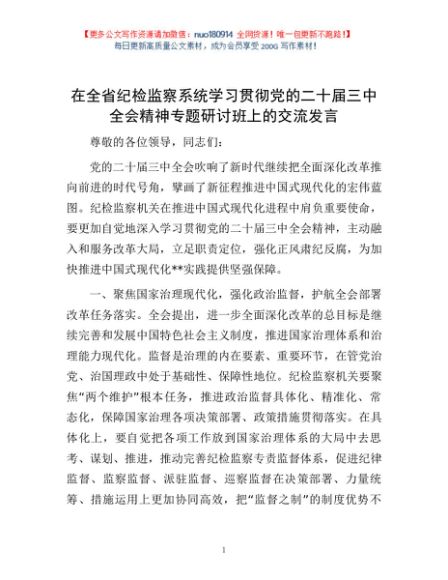 / 在全省纪检监察系统学习贯彻党的二十届三中全会精神专题研讨班上的交流发言