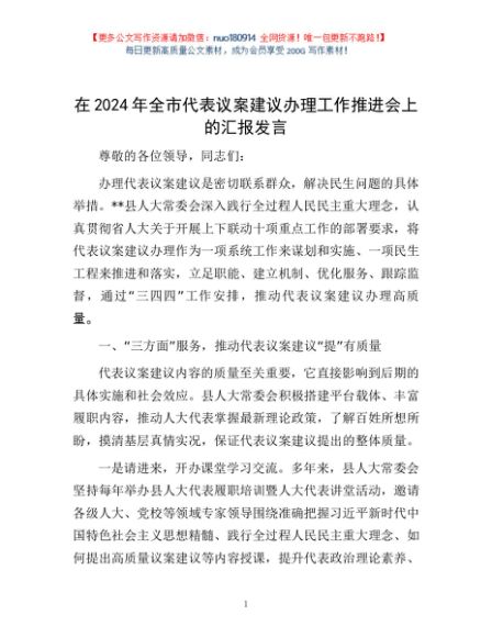 / 在2024年全市代表议案建议办理工作推进会上的汇报发言