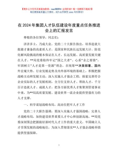 / 在2024年集团人才队伍建设年度重点任务推进会上的汇报发言