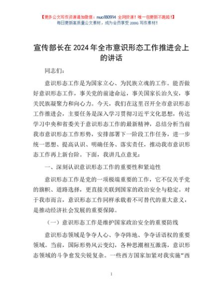 / 宣传部长在2024年全市意识形态工作推进会上的讲话