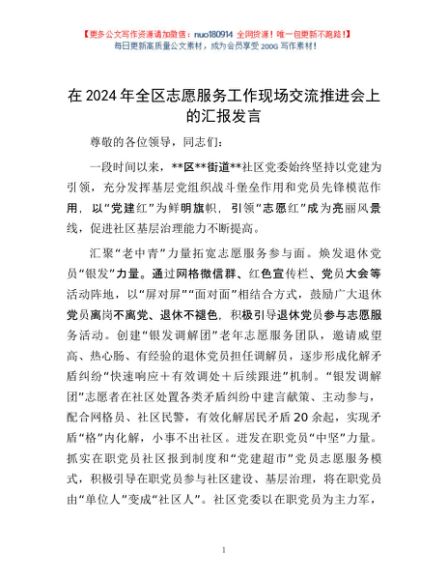 / 在2024年全区志愿服务工作现场交流推进会上的汇报发言