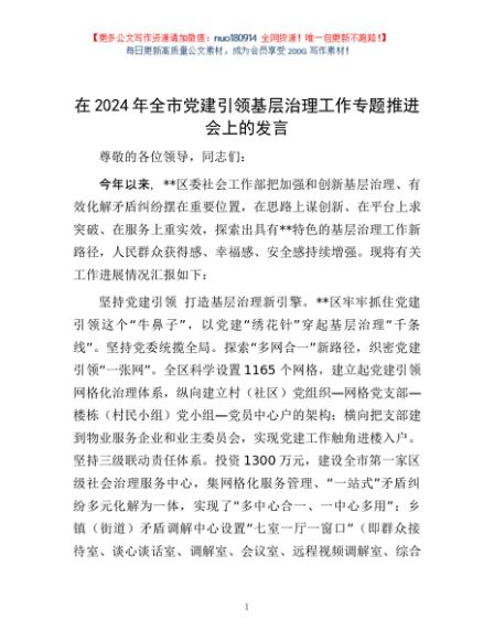 / 在2024年全市党建引领基层治理工作专题推进会上的发言