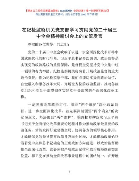 / 在纪检监察机关党支部学习贯彻党的二十届三中全会精神研讨会上的交流发言