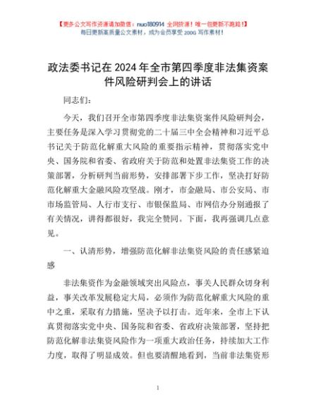 / 政法委书记在2024年全市第四季度非法集资案件风险研判会上的讲话