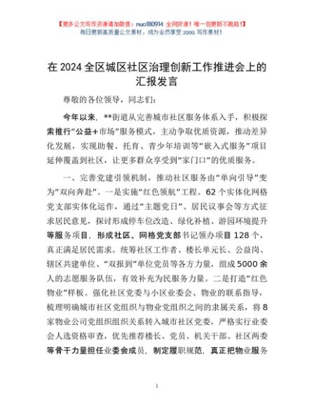 / 在2024全区城区社区治理创新工作推进会上的汇报发言
