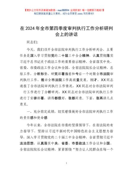 / 在2024年全市第四季度审判执行工作分析研判会上的讲话