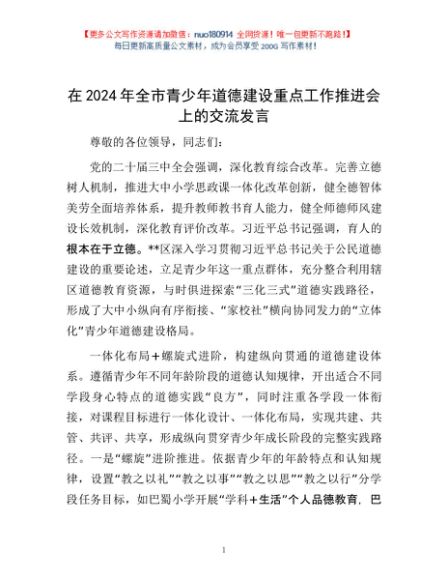 / 在2024年全市青少年道德建设重点工作推进会上的交流发言