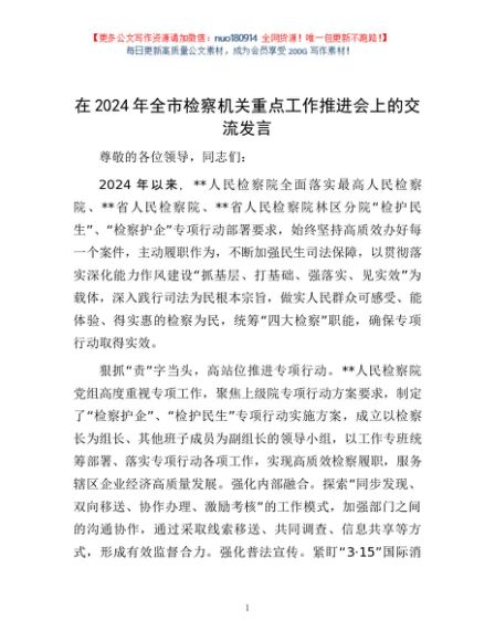 / 在2024年全市检察机关重点工作推进会上的交流发言