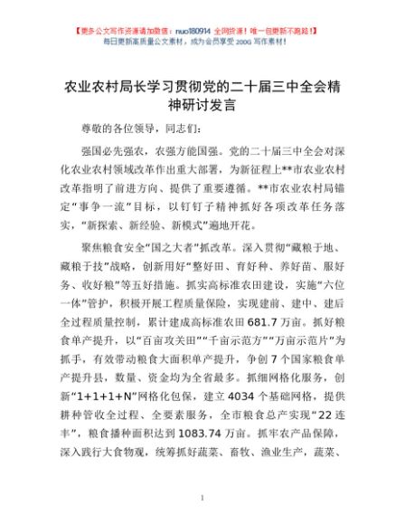 / 农业农村局长学习贯彻党的二十届三中全会精神研讨发言