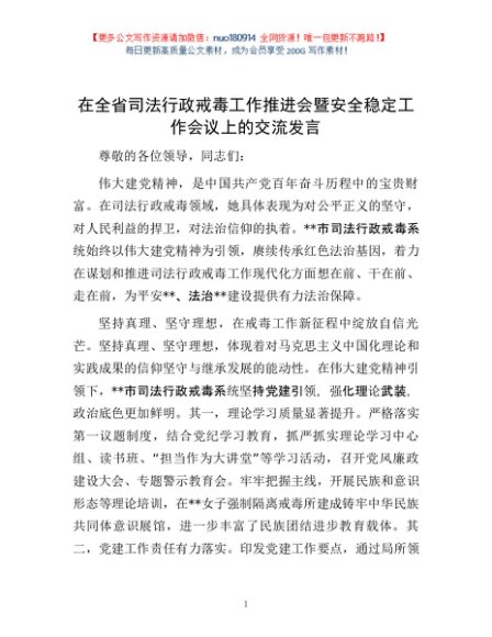 / 在全省司法行政戒毒工作推进会暨安全稳定工作会议上的交流发言