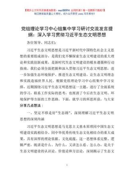/ 党组理论学习中心组集中学习研讨交流发言提纲:深入学习贯彻习近平生态文明思想