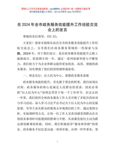 / 在2024年全市政务服务效能提升工作经验交流会上的发言