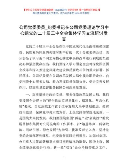 / 公司党委委员_纪委书记在公司党委理论学习中心组党的二十届三中全会集体学习交流研讨发言