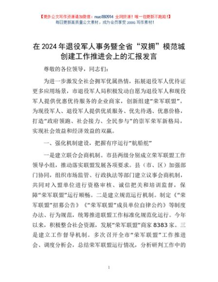 / 在2024年退役军人事务暨全省“双拥”模范城创建工作推进会上的汇报发言