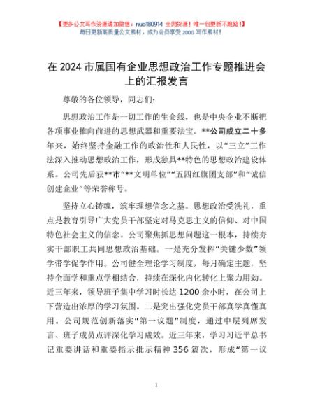 / 在2024市属国有企业思想政治工作专题推进会上的汇报发言
