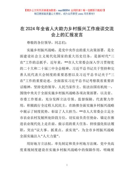 / 在2024年全省人大助力乡村振兴工作座谈交流会上的汇报发言