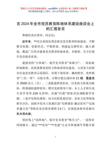 / 在2024年全市党员教育阵地体系建设座谈会上的汇报发言