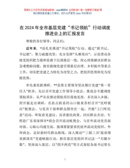 / 在2024年全市基层党建“书记领航”行动调度推进会上的汇报发言