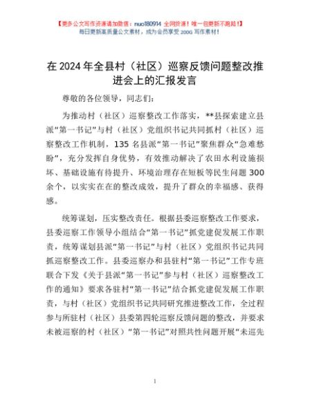 / 在2024年全县村(社区)巡察反馈问题整改推进会上的汇报发言