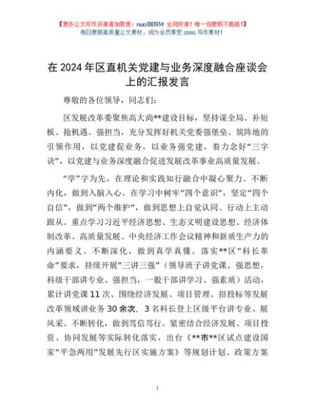 / 在2024年区直机关党建与业务深度融合座谈会上的汇报发言