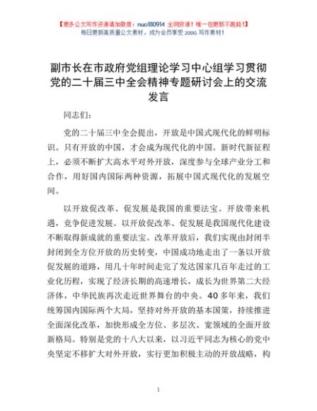 / 副市长在市政府党组理论学习中心组学习贯彻党的二十届三中全会精神专题研讨会上的交流发言
