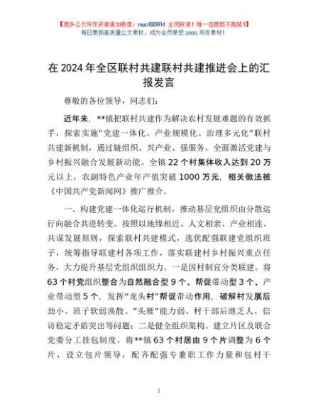 / 在2024年全区联村共建联村共建推进会上的汇报发言