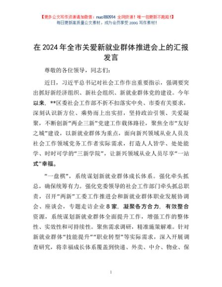/ 在2024年全市关爱新就业群体推进会上的汇报发言
